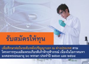 รับสมัครให้ทุนการศึกษาสำหรับบุคคลทั่วไปเพื่อพัฒนาอาจารย์แพทย์นักวิจัย และอาจารย์สาขาวิทยาศาสตร์และสิ่งแวดล้อมศึกษาต่อในระดับปริญญาเอก ณ ต่างประเทศ ตามโครงการทุนเฉลิมพระเกียรติเจ้าฟ้าจุฬาภรณ์ เนื่องในโอกาสมหามงคลพระชนมายุ ๖๐ พรรษา ประจำปีงบประมาณ พ.ศ. ๒๕๖๔ (รอบ ๒) ดูรายละเอียด