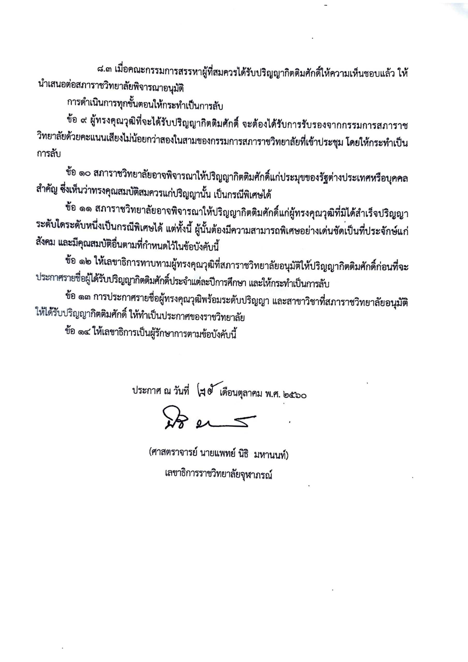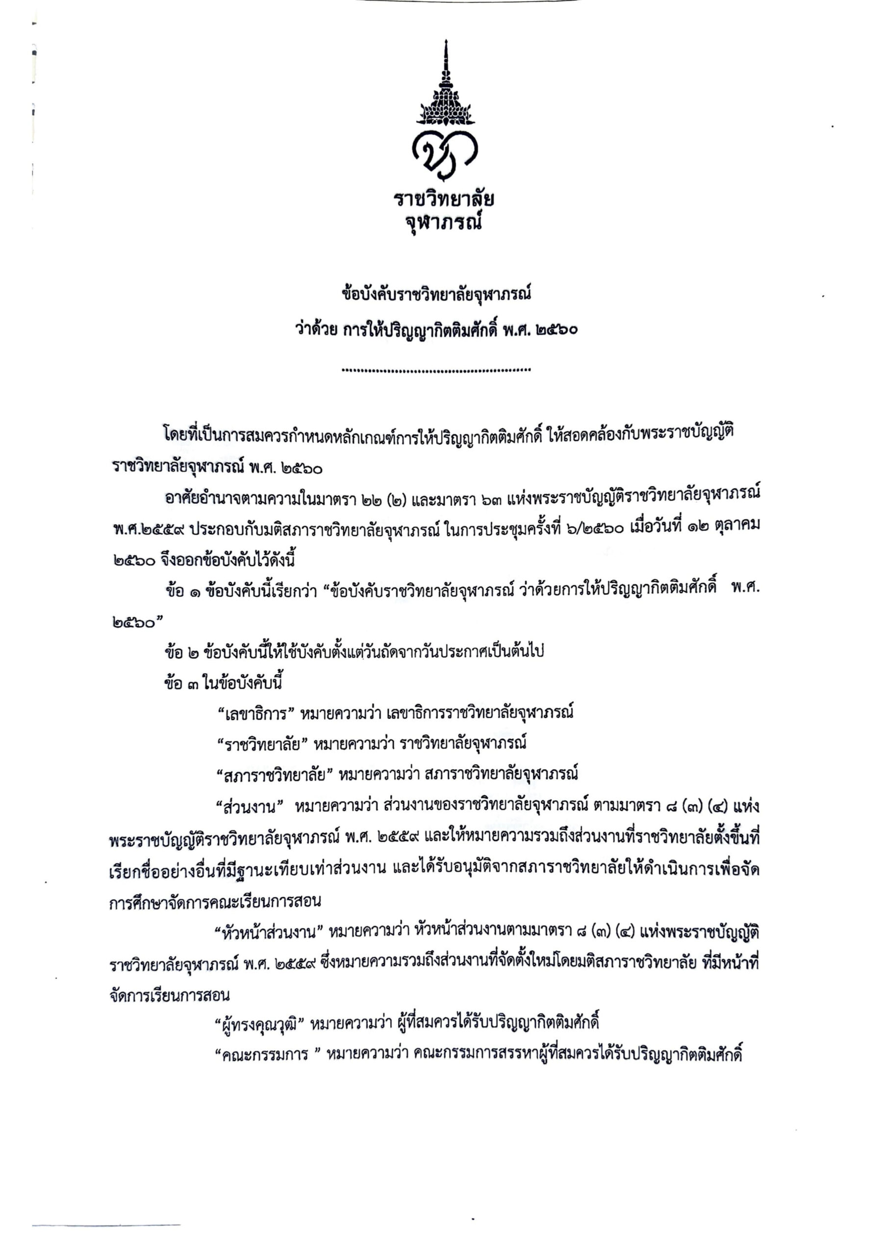 ข้อบังคับราชวิทยาลัยจุฬาภรณ์ ว่าด้วยการให้ปริญญากิตติมศักดิ์ พ.ศ. ๒๕๖๐