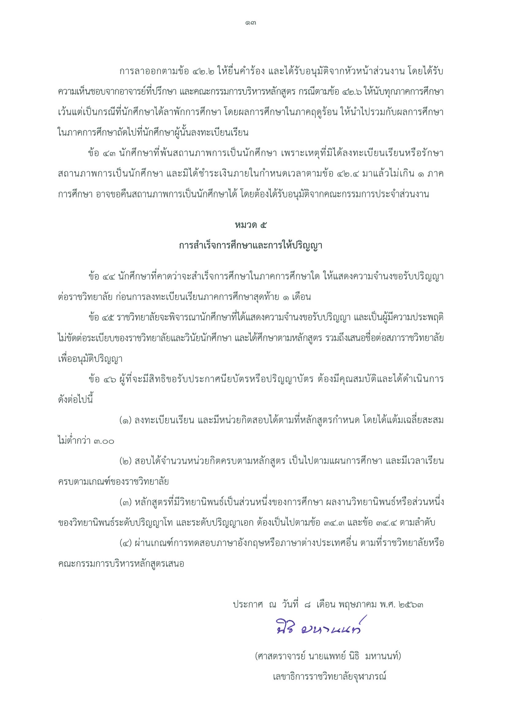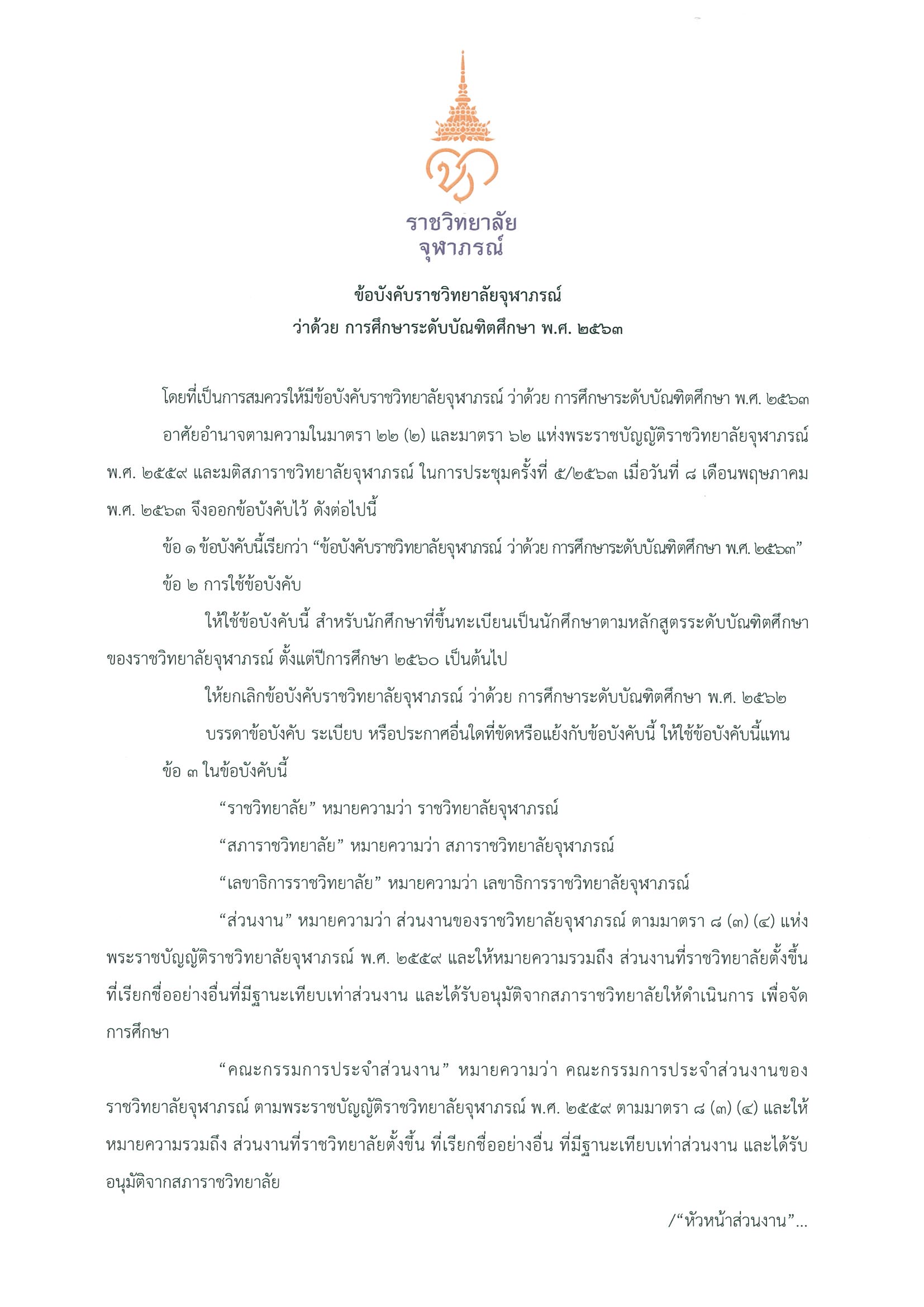 ประกาศรจภ. เรื่อง ข้อบังคับราชวิทยาลัยจุฬาภรณ์ว่าด้วยการศึกษาระดับบัณฑิต พ.ศ.2563
