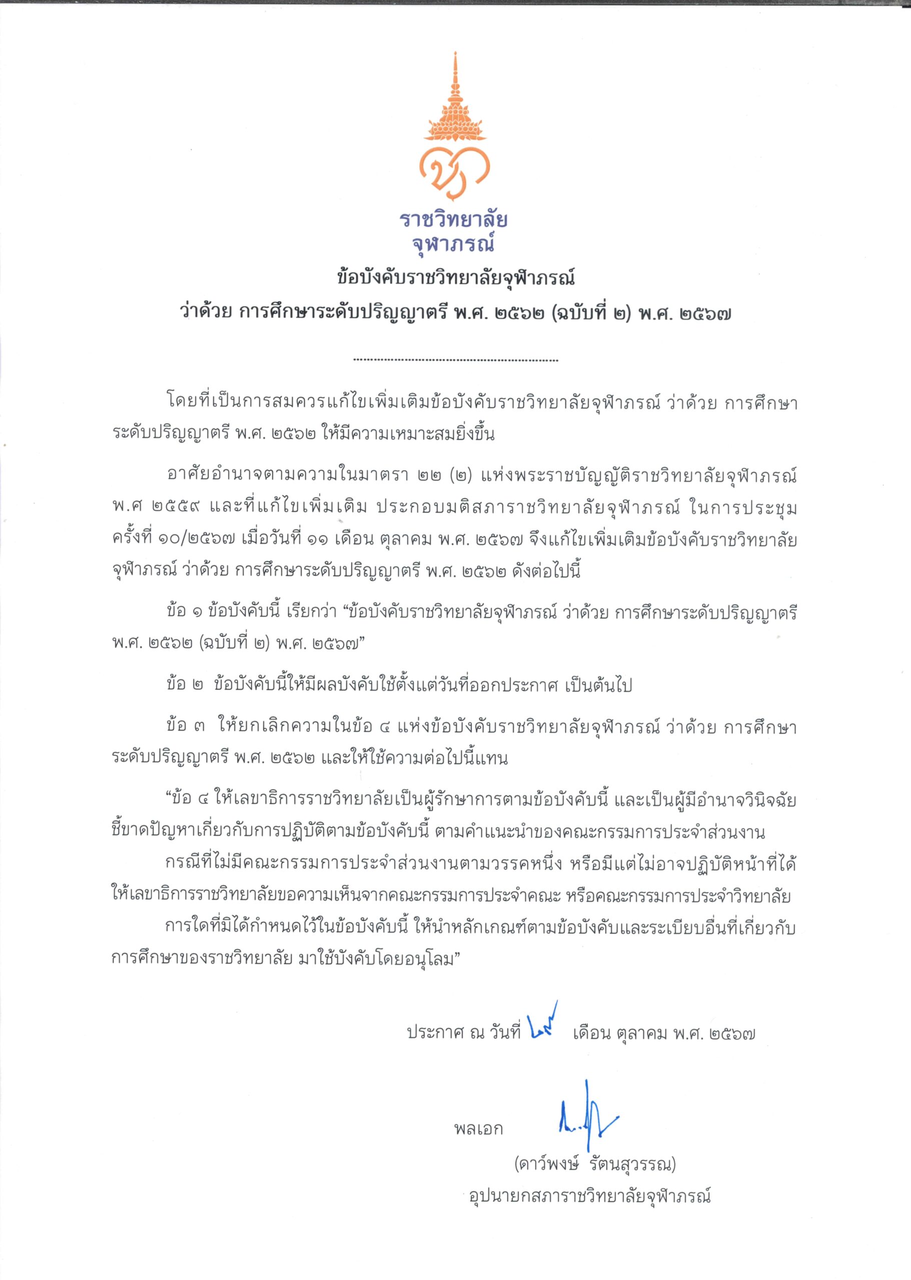 หน้าแรก > ข้อบังคับราชวิทยาลัยจุฬาภรณ์ ว่าด้วย การศึกษาระดับปริญญาตรี พ.ศ. ๒๕๖๒ (ฉบับที่ ๒) พ.ศ. ๒๕๖๗