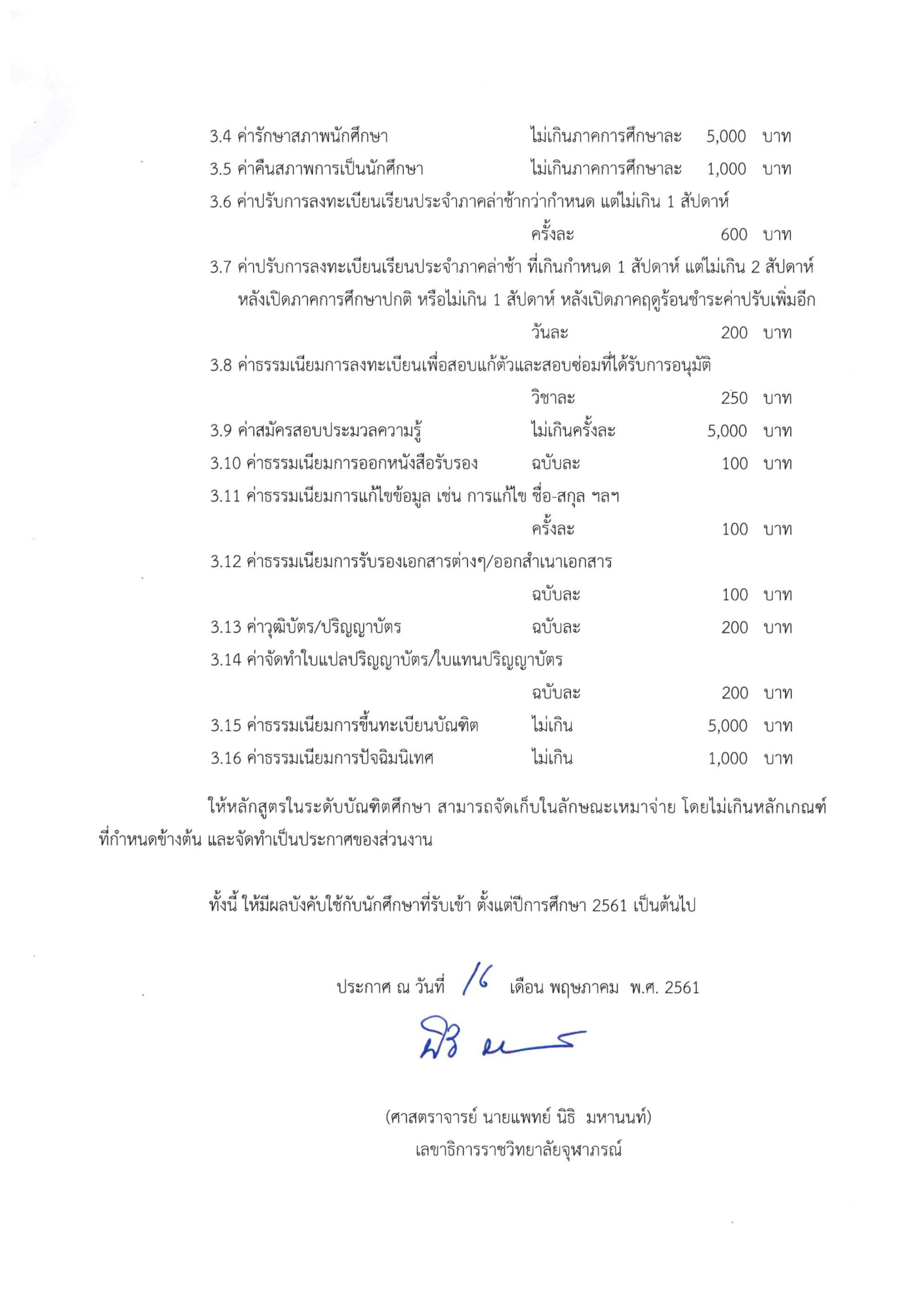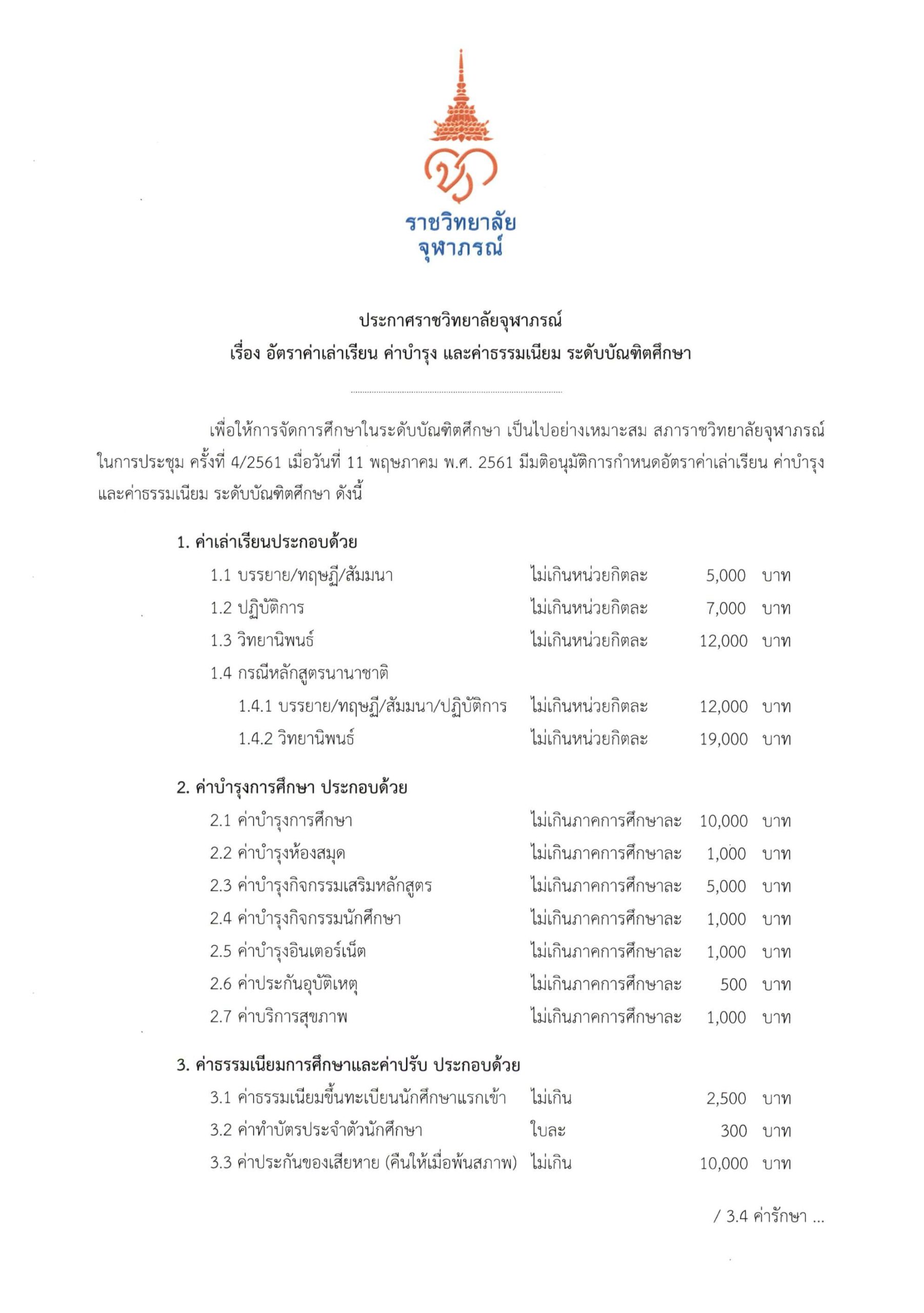 หน้าแรก > ประกาศราชวิทยาลัยจุฬาภรณ์ เรื่อง อัตราค่าเล่าเรียน ค่าบำรุง และค่าธรรมเนียม ระดับบัณฑิตศึกษา