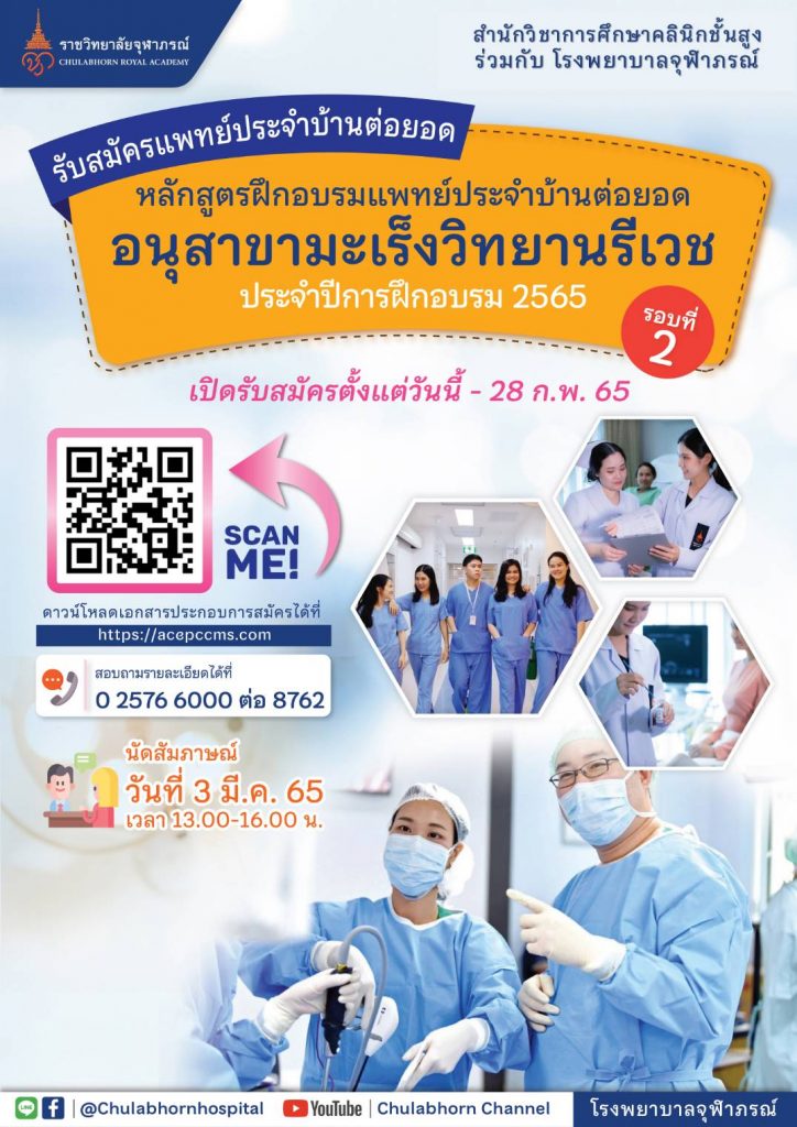 สำนักวิชาการศึกษาคลิกนิกชั้นสูง วิทยาลัยวิทยาศาสตร์การแพทย์เจ้าฟ้าจุฬาภรณ์ ราชวิทยาลัยจุฬาภรณ์ ร่วมกับ โรงพยาบาลจุฬาภรณ เปิดรับสมัครแพทย์ประจำบ้านต่อยอด หลักสูตรฝึกอบรมแพทย์ประจำบ้านต่อยอด อนุสาขามะเร็งวิทยานรีเวช ประจำปีการฝึกอบรม 2565 รอบที่ 2