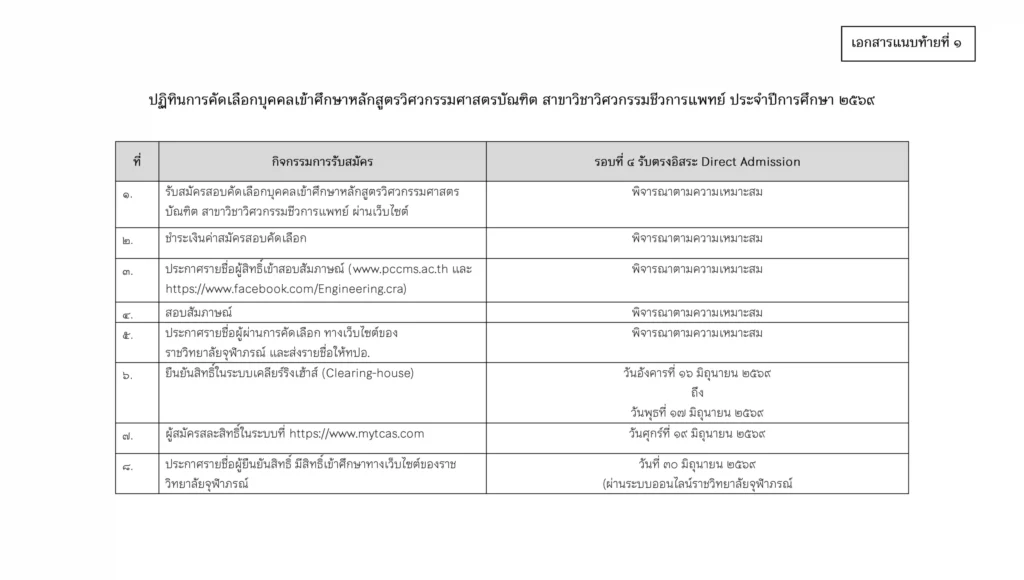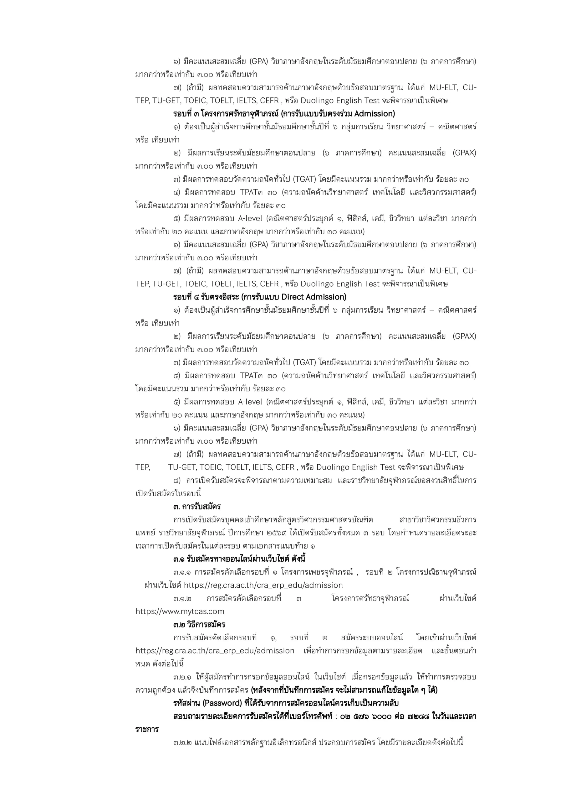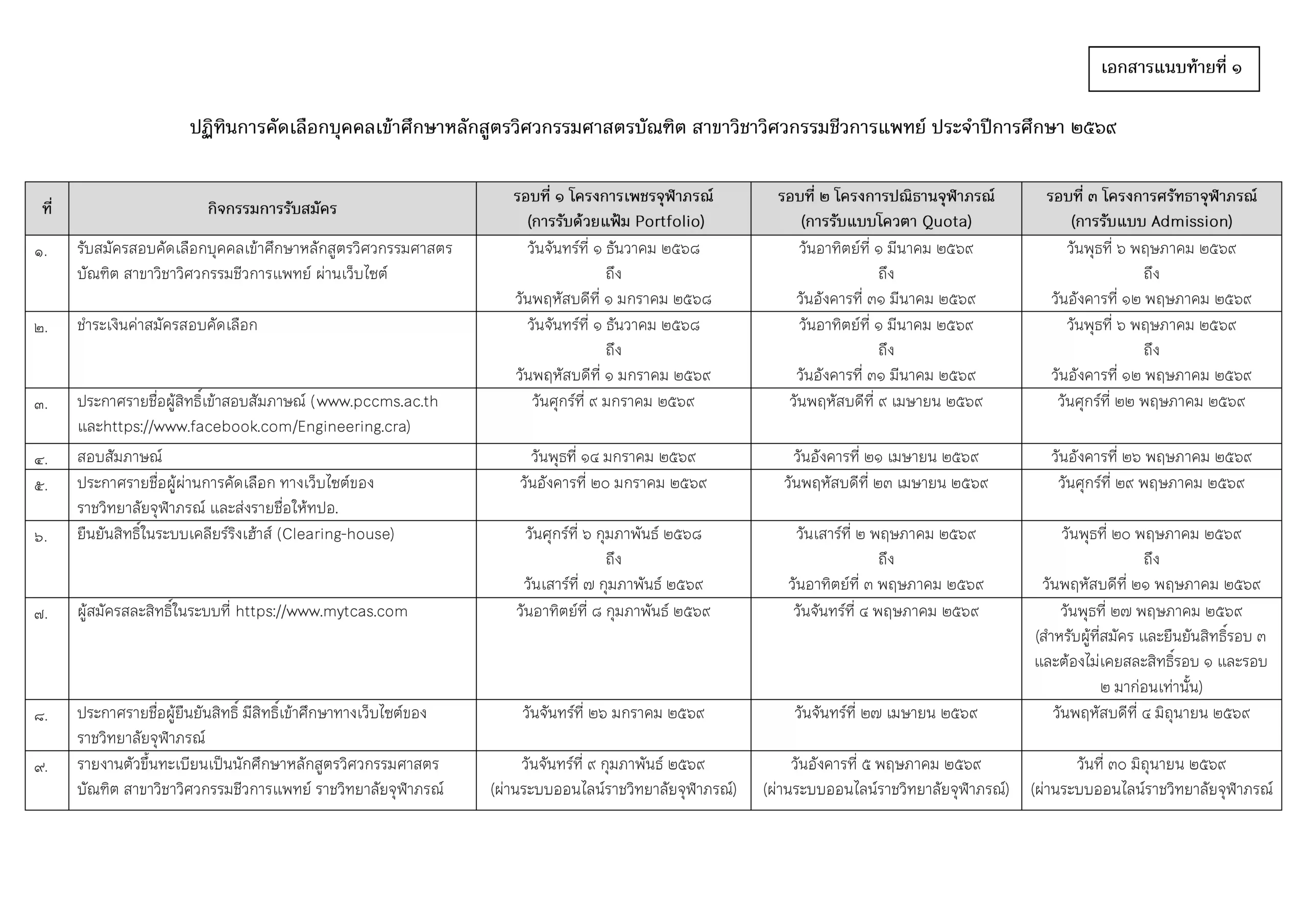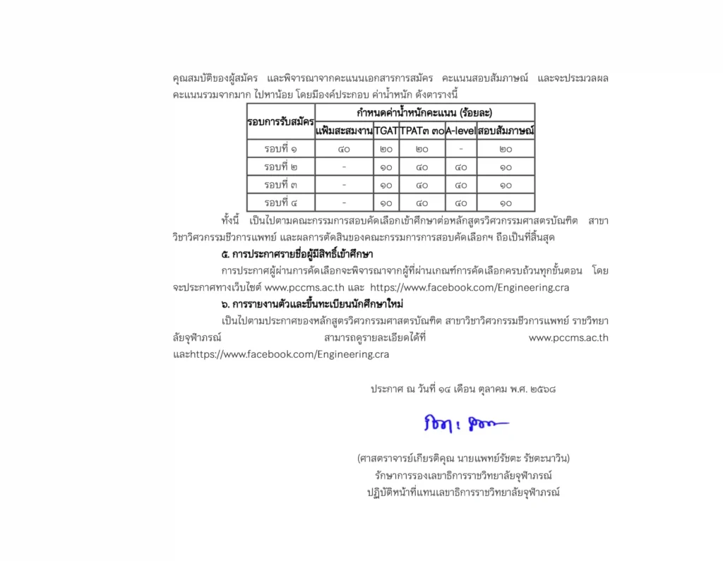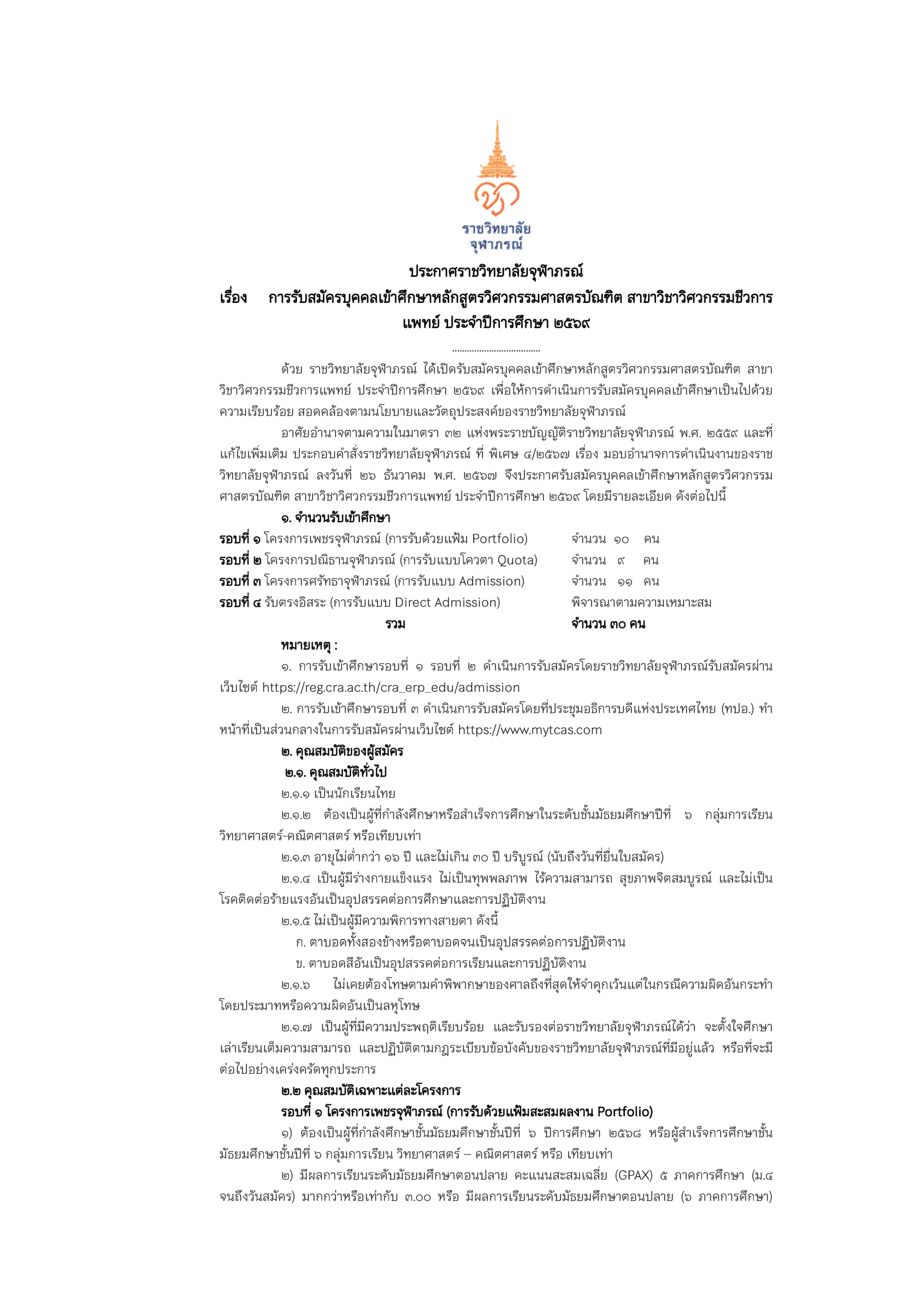 หน้าแรก > ประกาศ ราชวิทยาลัยจุฬาภรณ์ เรื่อง การรับสมัครบุคคลเข้าศึกษาหลักสูตรวิศวกรรมศาสตรบัณฑิต สาขาวิชาวิศวกรรมชีวการแพทย์ ประจำปีการศึกษา ๒๕๖๘