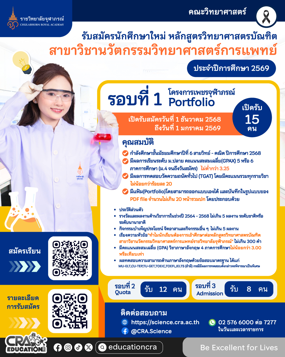 ราชวิทยาลัยจุฬาภรณ์ คณะวิทยาศาสตร์ เปิดรับสมัครนักศึกษาใหม่ หลักสูตรวิทยาศาสตรบัณฑิต สาขาวิชานวัตกรรมวิทยาศาสตร์การแพทย์ ประจำปีการศึกษา 2569 ใน รอบที่ 1 Portfolio