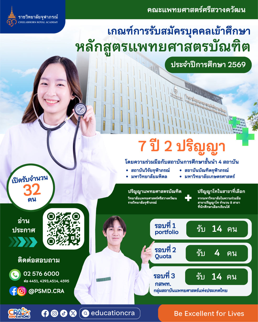 🎓 เปิดรับสมัคร! หลักสูตรแพทยศาสตรบัณฑิต ปีการศึกษา 2569 คณะแพทยศาสตร์ศรีสวางควัฒน ราชวิทยาลัยจุฬาภรณ์