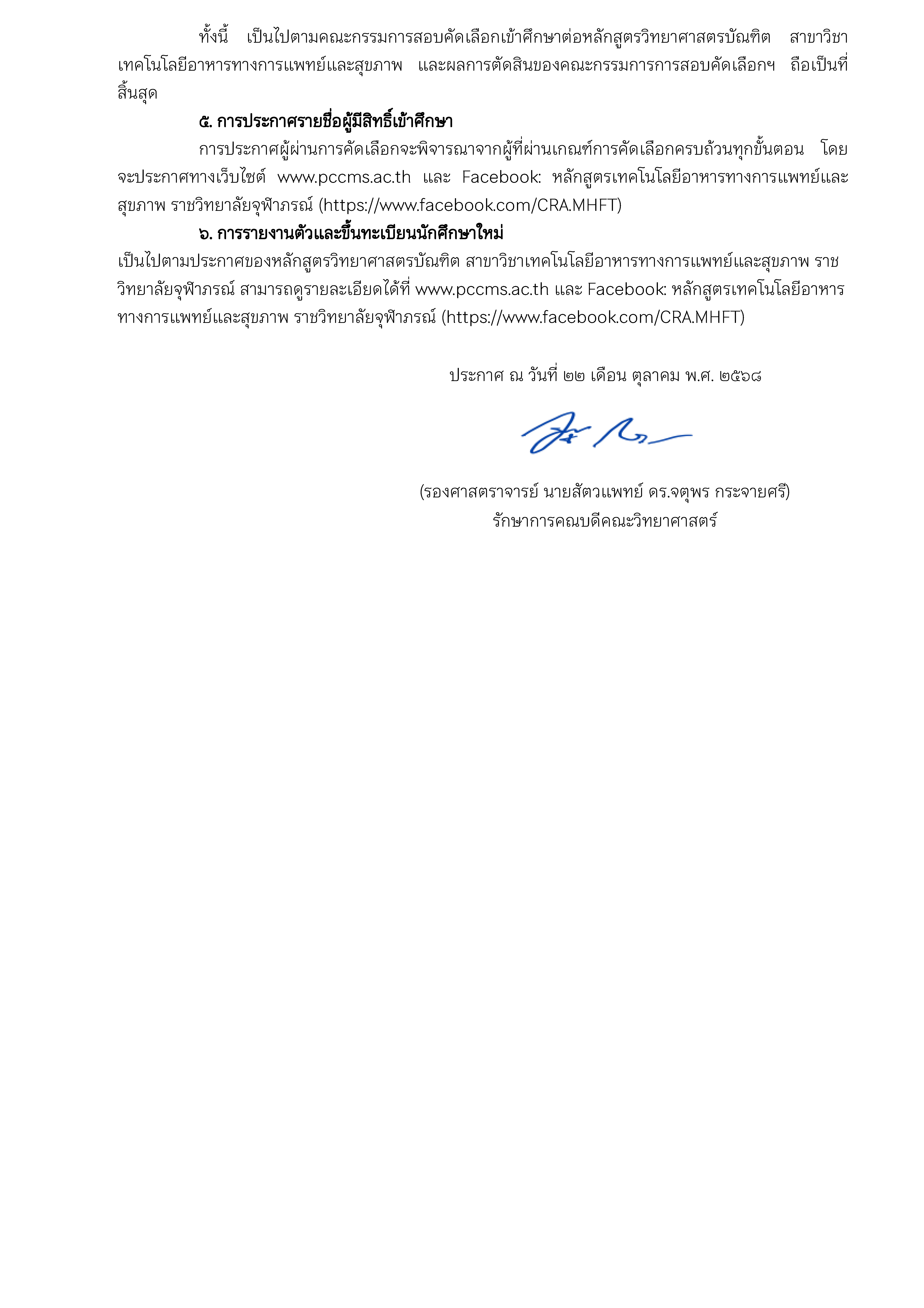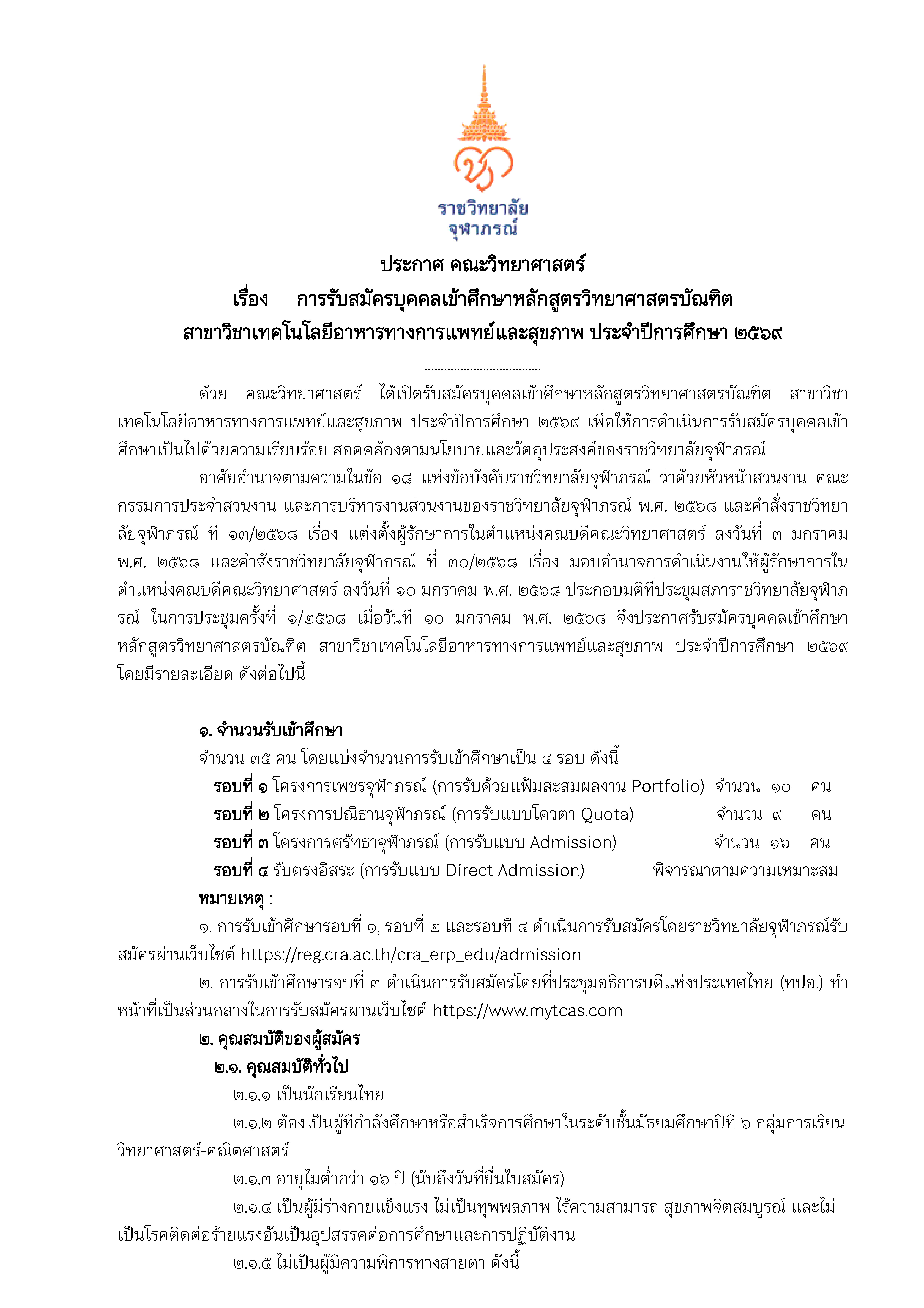 ประกาศ คณะวิทยาศาสตร์ เรื่อง การรับสมัครบุคคลเข้าศึกษาหลักสูตรวิทยาศาสตรบัณฑิต สาขาวิชาเทคโนโลยีอาหารทางการแพทย์และสุขภาพ ประจำปีการศึกษา ๒๕๖๙ 25 ต.ค. 2568 FacebookTwitterLine