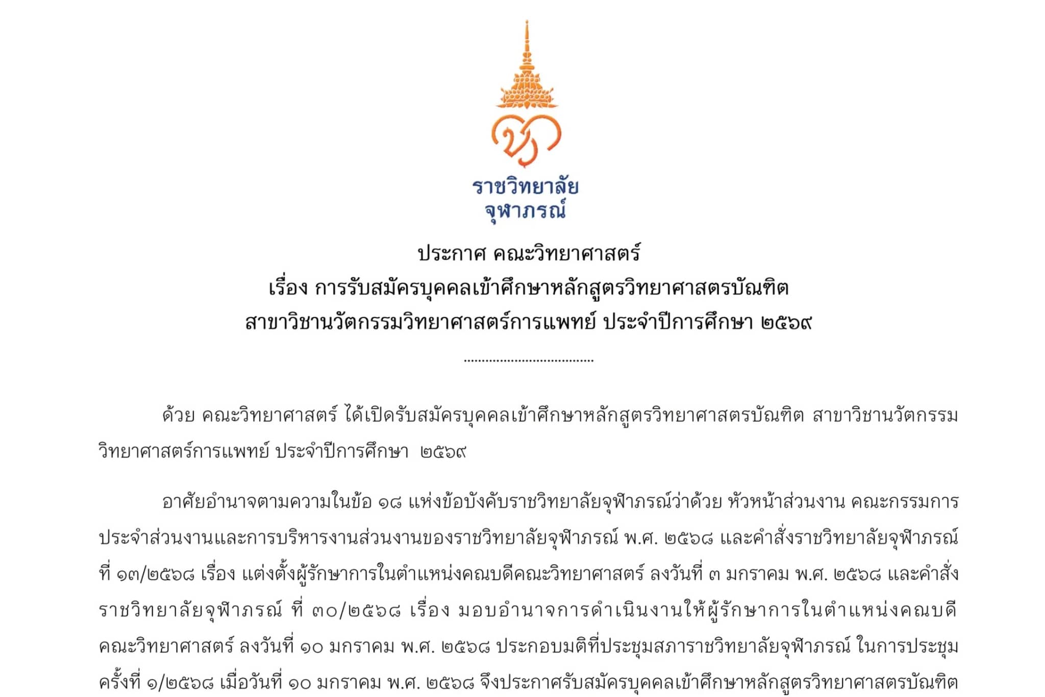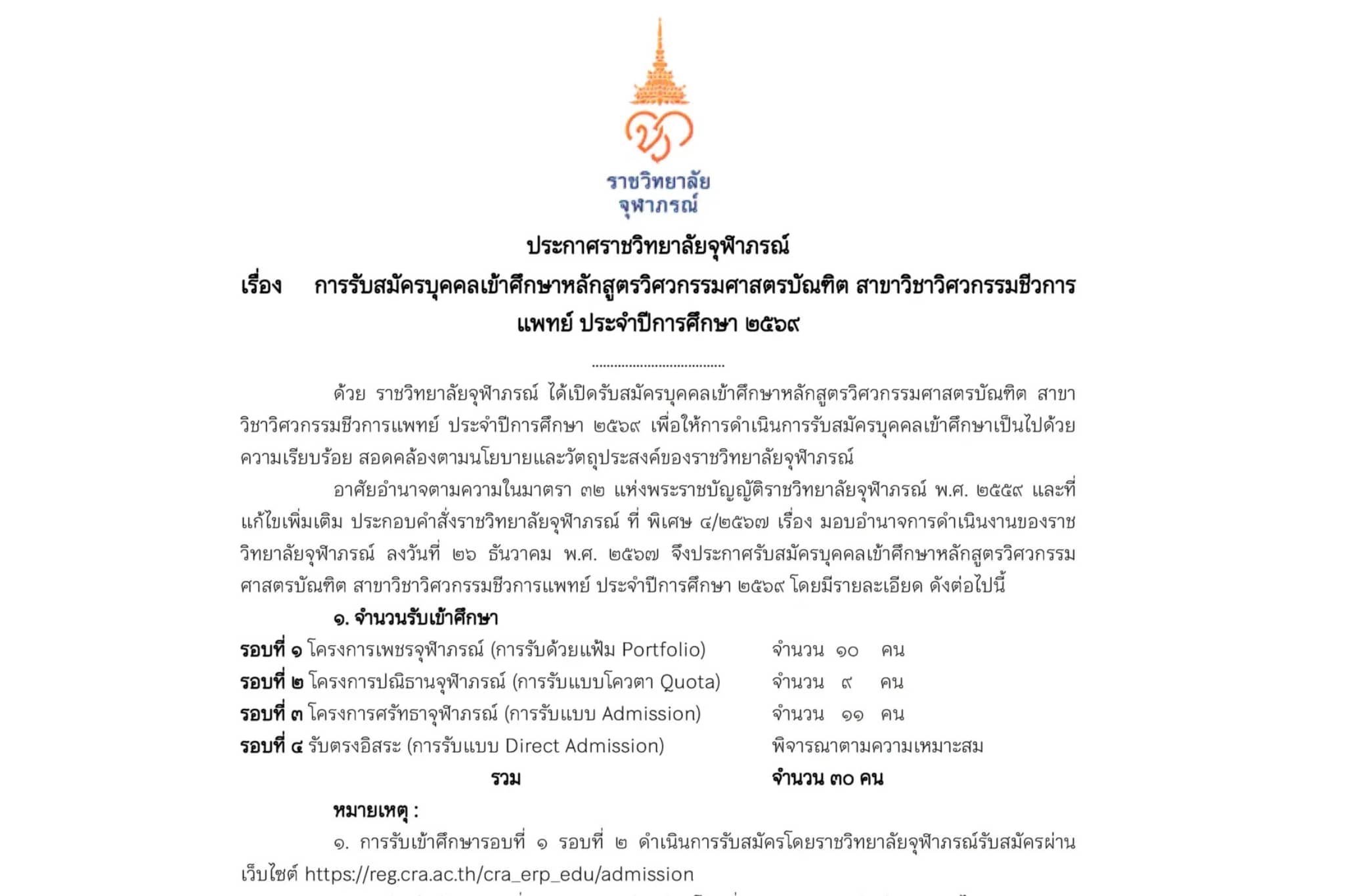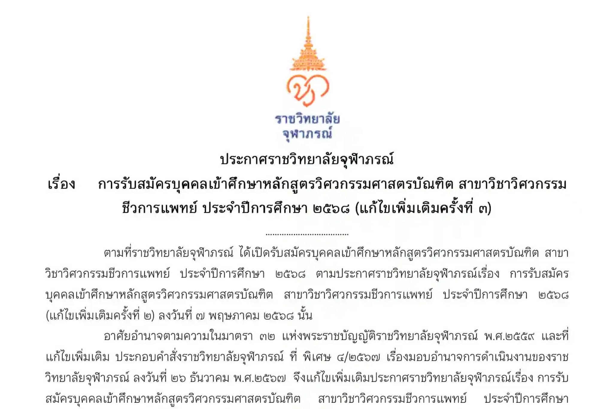 ประกาศ ราชวิทยาลัยจุฬาภรณ์ เรื่อง การรับสมัครบุคคลเข้าศึกษาหลักสูตรวิศวกรรมศาสตรบัณฑิต สาขาวิชาวิศวกรรมชีวการแพทย์ ประจำปีการศึกษา ๒๕๖๘