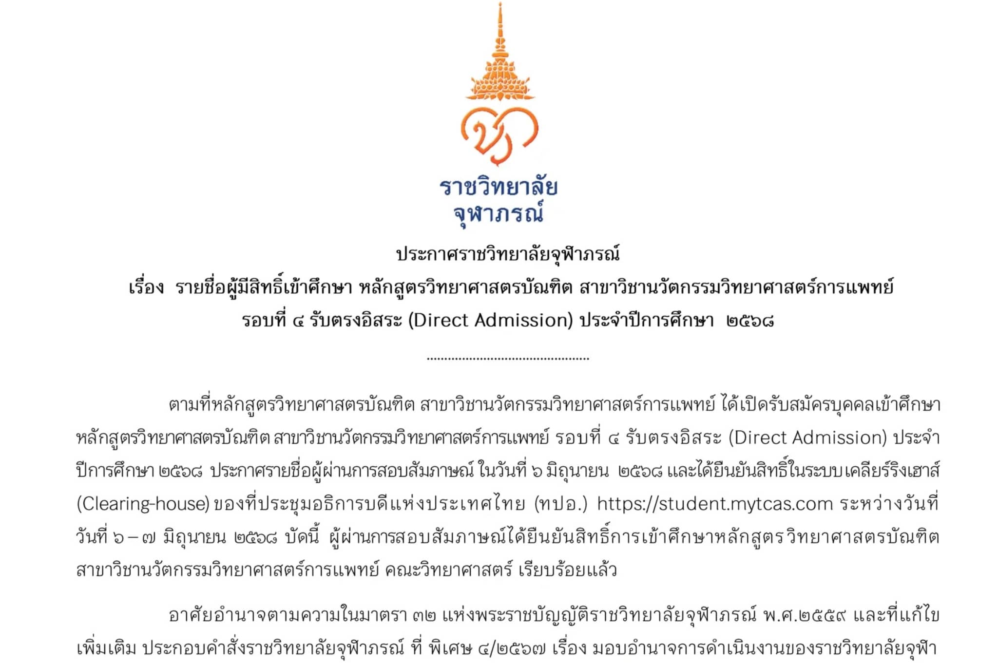 ประกาศ รายชื่อผู้มีสิทธิ์เข้าศึกษา หลักสูตรวิทยาศาสตรบัณฑิต สาขาวิชานวัตกรรมวิทยาศาสตร์การแพทย์ รอบที่ ๔ รับตรงอิสระ (Direct Admission) ประจำปีการศึกษา ๒๕๖๘