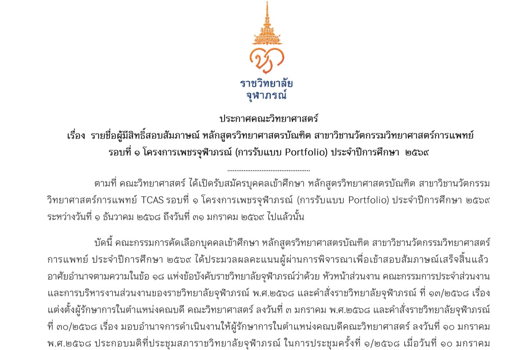 ประกาศคณะวิทยาศาสตร์ เรื่อง รายชื่อผู้มีสิทธิ์เข้าศึกษา หลักสูตรวิทยาศาสตรบัณฑิต สาขาวิชานวัตกรรมวิทยาศาสตร์การแพทย์ รอบที่ ๑ โครงการเพชรจุฬาภรณ์ (การรับแบบ Portfolio) ประจำปีการศึกษา ๒๕๖๙
