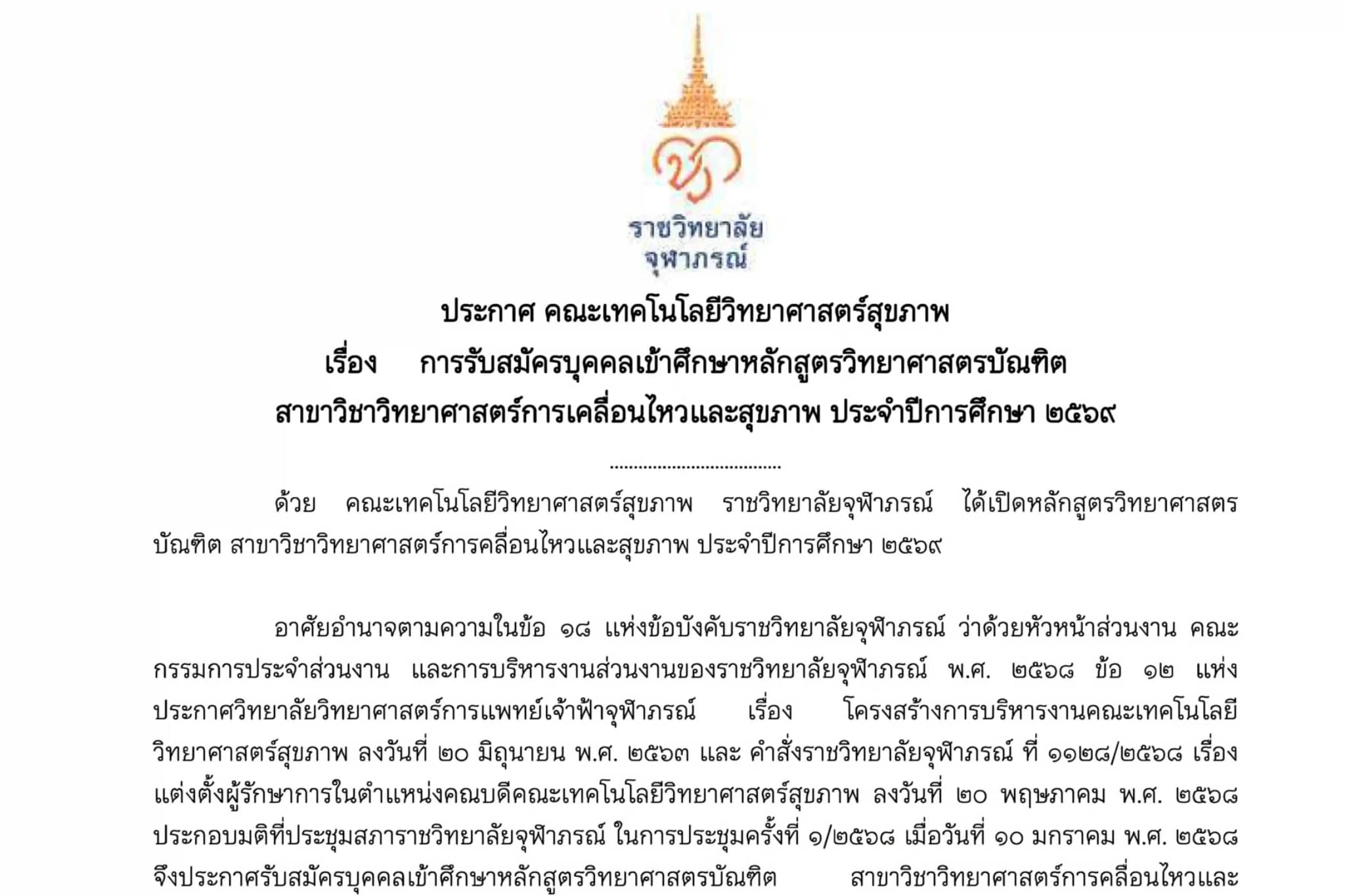 ประกาศ คณะเทคโนโลยีวิทยาศาสตร์สุขภาพ เรื่อง การรับสมัครบุคคลเข้าศึกษาหลักสูตรวิทยาศาสตรบัณฑิต สาขาวิชาวิทยาศาสตร์การเคลื่อนไหวและสุขภาพ ประจำปีการศึกษา ๒๕๖๙