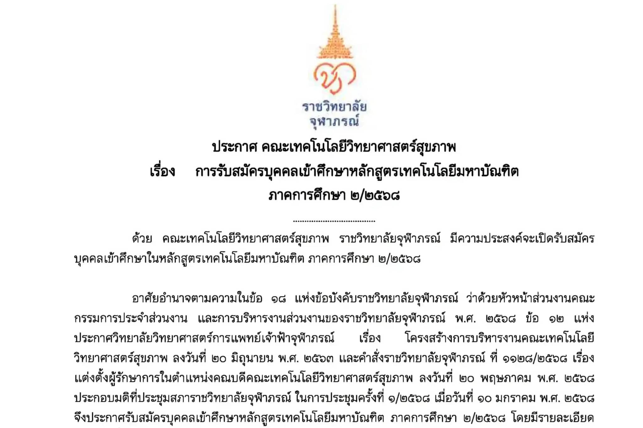 ประกาศ คณะเทคโนโลยีวิทยาศาสตร์สุขภาพ เรื่อง การรับสมัครบุคคลเข้าศึกษาหลักสูตรเทคโนโลยีมหาบัณฑิต ภาคการศึกษา ๒/๒๕๖๘