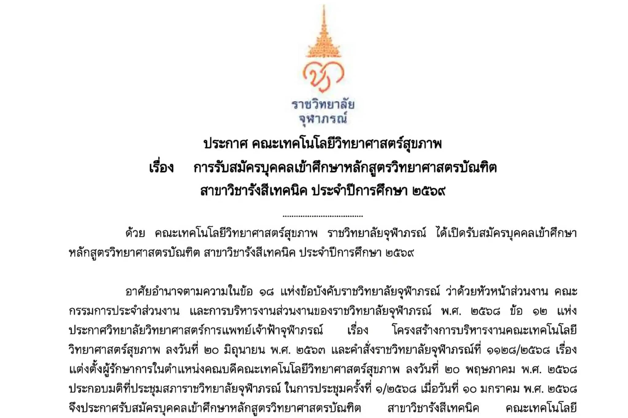 ประกาศ คณะเทคโนโลยีวิทยาศาสตร์สุขภาพ เรื่อง การรับสมัครบุคคลเข้าศึกษาหลักสูตรวิทยาศาสตรบัณฑิต สาขาวิชารังสีเทคนิค ประจำปีการศึกษา ๒๕๖๙