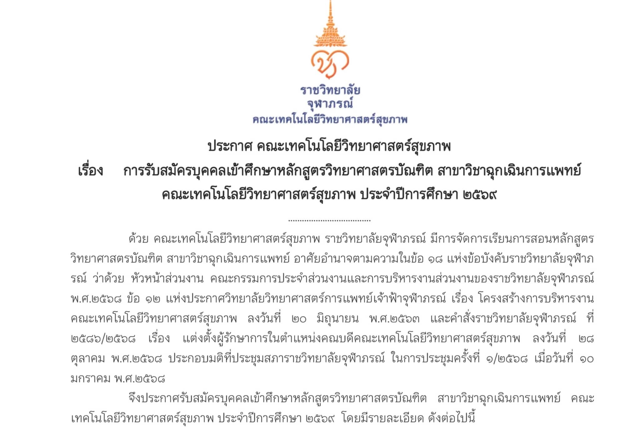 ประกาศ คณะเทคโนโลยีวิทยาศาสตร์สุขภาพ เรื่อง การรับสมัครบุคคลเข้าศึกษาหลักสูตรวิทยาศาสตรบัณฑิต สาขาวิชาฉุกเฉินการแพทย์ คณะเทคโนโลยีวิทยาศาสตร์สุขภาพ ประจำปีการศึกษา ๒๕๖๙