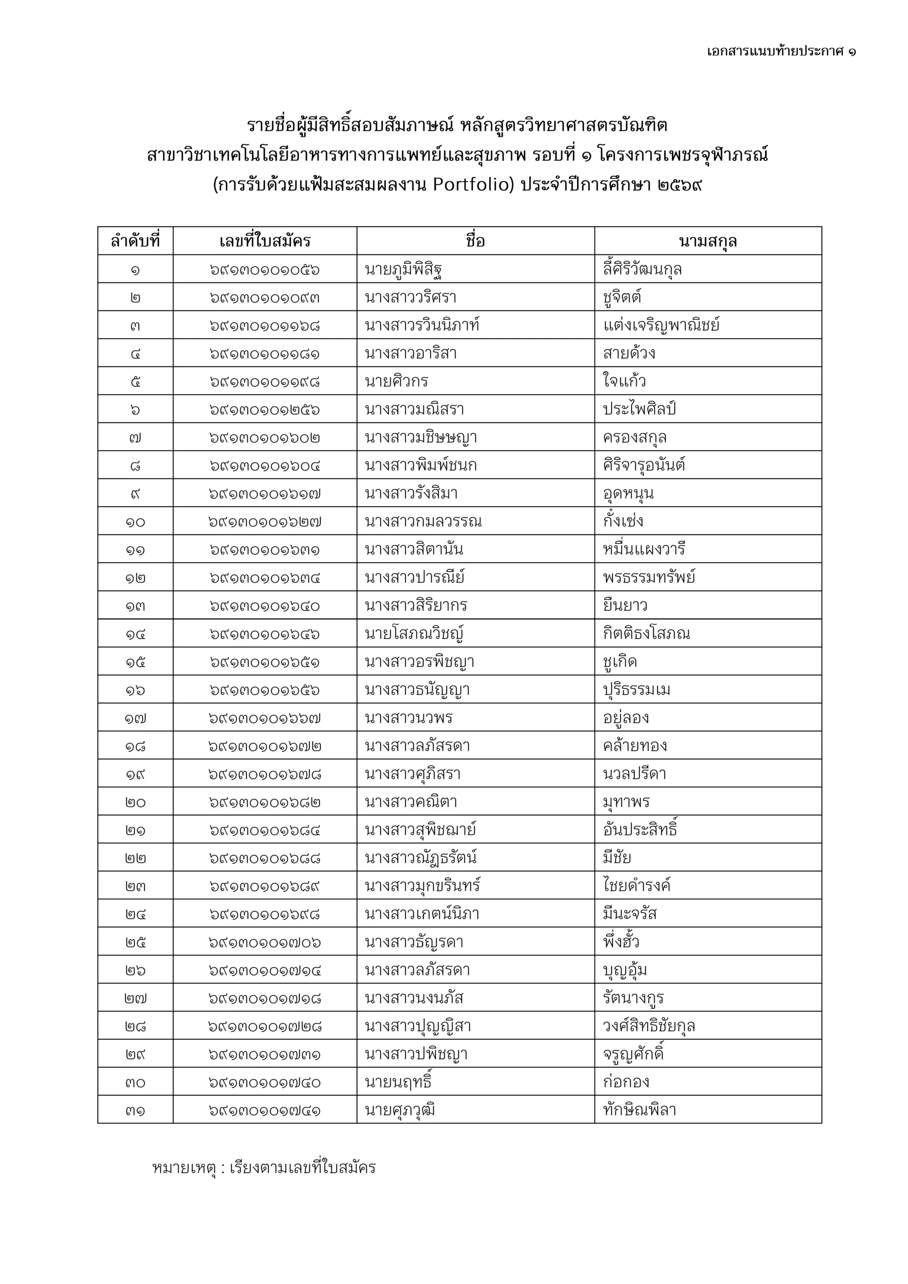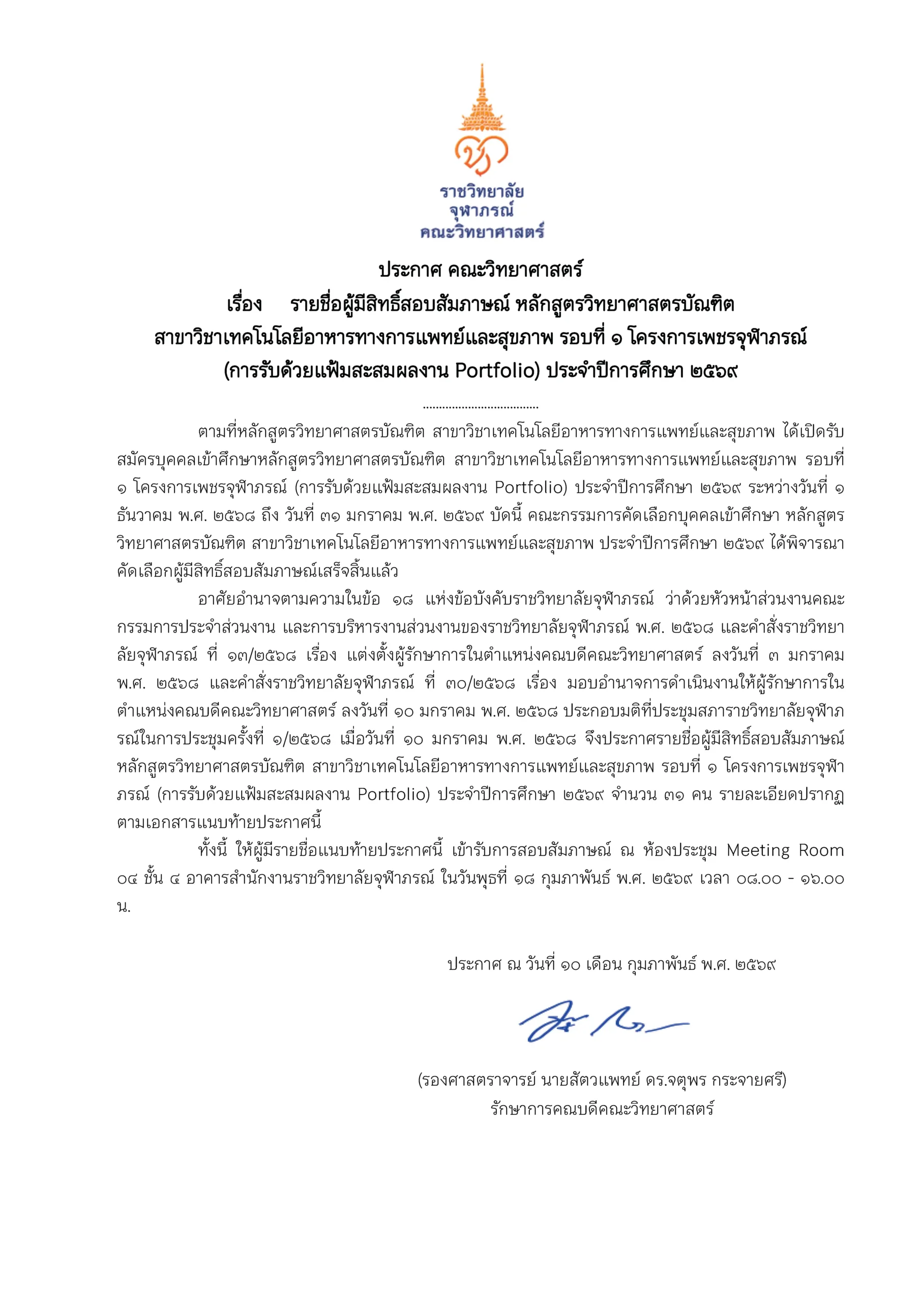 หน้าแรก > ประกาศคณะวิทยาศาสตร์ เรื่อง รายชื่อผู้มีสิทธิ์สอบสัมภาษณ์ หลักสูตรวิทยาศาสตร์บัณฑิต สาขาวิชาเทคโนโลยีอาหารทางการแพทย์และสุขภาพ รอบที่ ๑ โครงการเพชรจุฬาภรณ์ (การรับด้วยแฟ้มสะสมผลงาน Portfolio) ประจำปีการศึกษา ๒๕๖๙