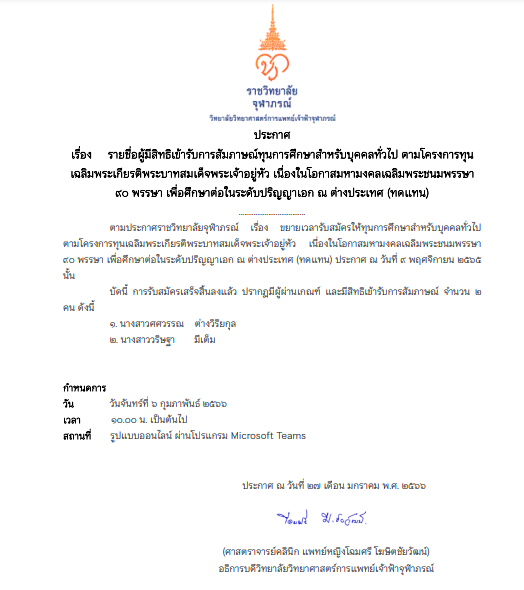 ประกาศรายชื่อผู้มีสิทธิเข้ารับการสัมภาษณ์ทุนการศึกษาสำหรับบุคคลทั่วไป ตามโครงการทุนเฉลิมพระเกียรติพระบาทสมเด็จพระเจ้าอยู่หัว เนื่องในโอกาสมหามงคลเฉลิมพระชนมพรรษา ๙๐ พรรษา เพื่อศึกษาต่อในระดับปริญญาเอก ณ ต่างประเทศ (ทดแทน)