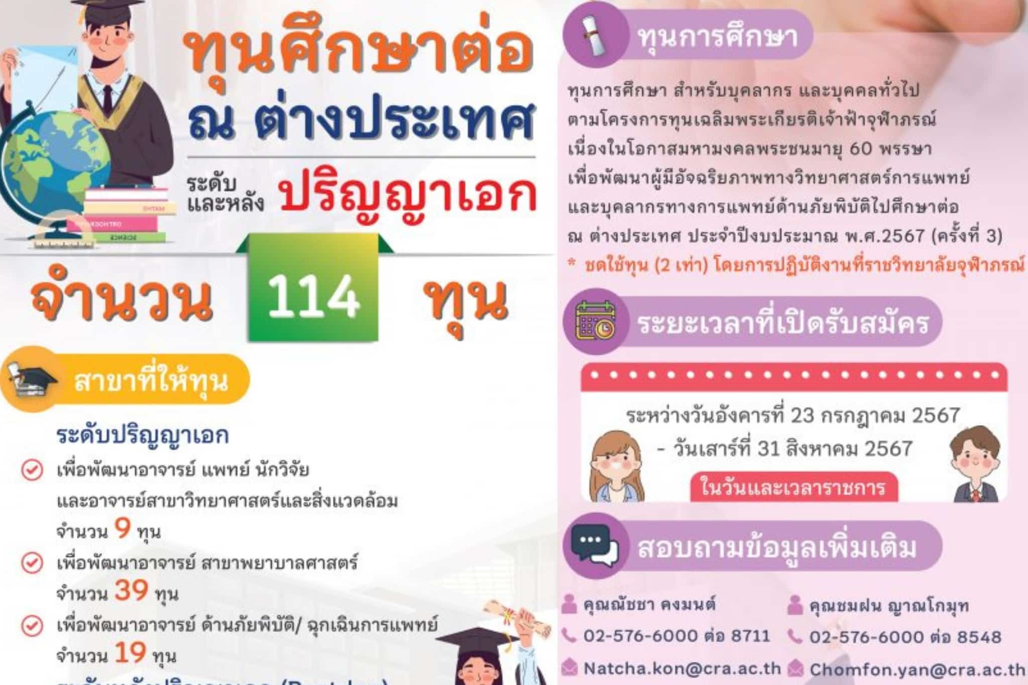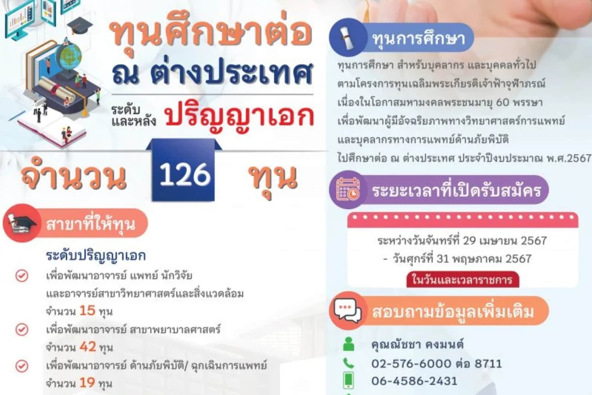 รับสมัครให้ทุนการศึกษา ตามโครงการทุนเฉลิมพระเกียรติเจ้าฟ้าจุฬาภรณ์ เนื่องในโอกาสมหามงคลพระชนมายุ 60 พรรษา เพื่อพัฒนาผู้มีอัจฉริยภาพทางวิทยาศาสตร์การแพทย์ และบุคลากรทางการแพทย์ด้านภัยพิบัติ ไปศึกษาต่อ ณ ต่างประเทศ ประจำปีงบประมาณ พ.ศ. 2567 (ครั้งที่ 2) ทุนการศึกษาระดับปริญญาเอก และหลังปริญญาเอก