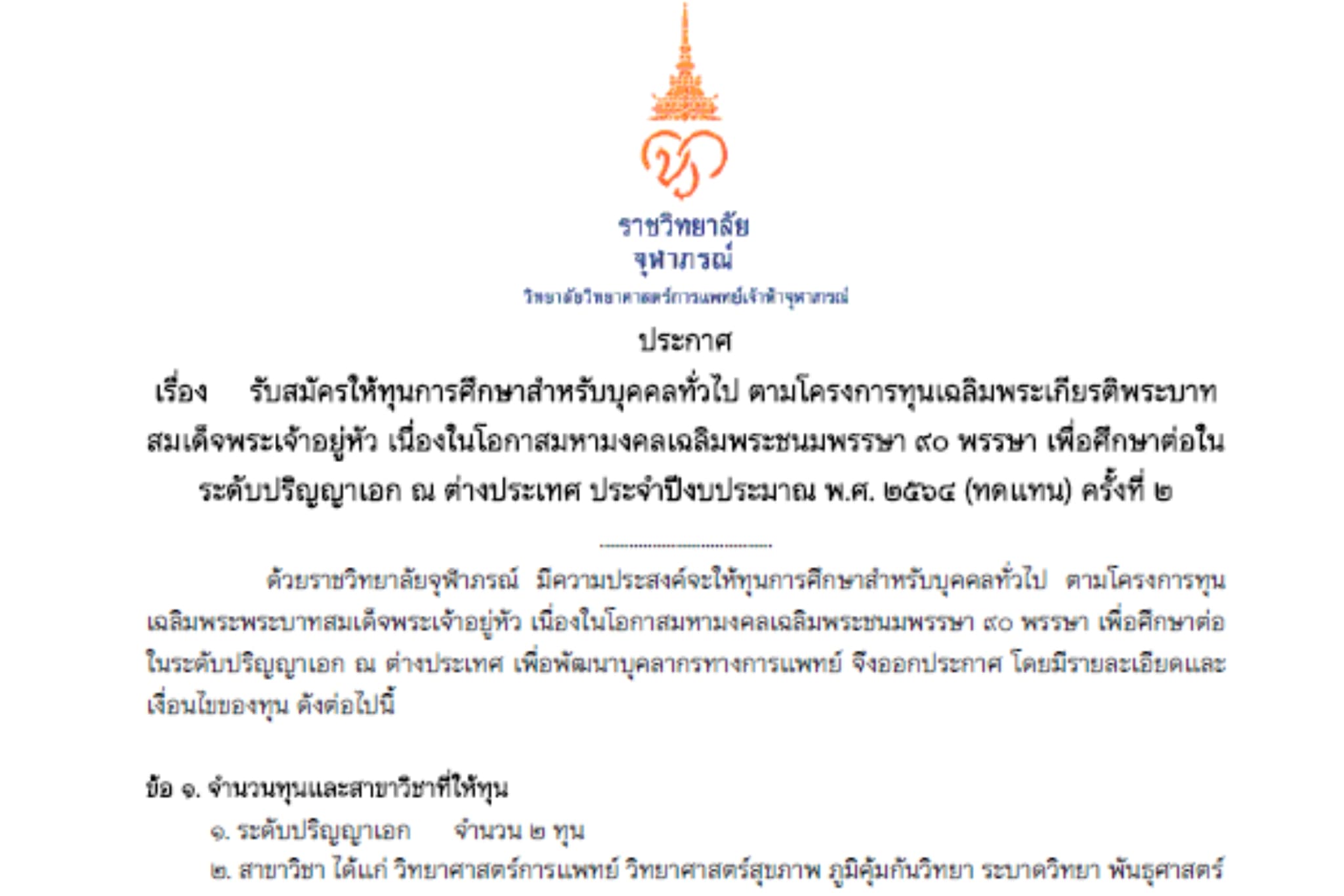 ประกาศรับสมัครให้ทุนการศึกษาสำหรับบุคคลทั่วไป ตามโครงการทุนเฉลิมพระเกียรติพระบาทสมเด็จพระเจ้าอยู่หัว เนื่องในโอกาสมหามงคลเฉลิมพระชนมพรรษา ๙๐ พรรษา เพื่อศึกษาต่อในระดับปริญญาเอก ณ ต่างประเทศ ประจำปีงบประมาณ พ.ศ. ๒๕๖๔ (ทดแทน) ครั้งที่ ๒