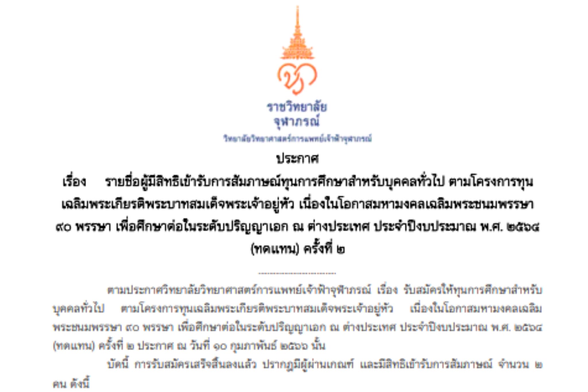 ประกาศรายชื่อผู้ได้รับคัดเลือกให้ทุนการศึกษาสำหรับบุคคลทั่วไป ตามโครงการทุนเฉลิมพระเกียรติพระบาทสมเด็จพระเจ้าอยู่หัว เนื่องในโอกาสมหามงคลเฉลิมพระชนมพรรษา ๙๐ พรรษา เพื่อศึกษาต่อในระดับปริญญาเอก ณ ต่างประเทศ ประจำปีงบประมาณ พ.ศ. ๒๕๖๔ (ทดแทน) ครั้งที่ ๒